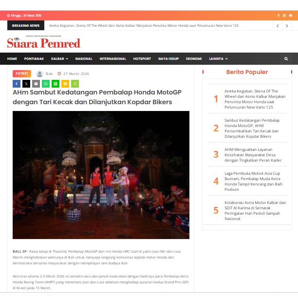 AHM Sambut Kedatangan Pembalap Honda MotoGP dengan Tari Kecak dan Dilanjutkan Kopdar Bikers by masmul 27 Maret 2026 in Silahkan kunjungi https://www.suarapemredkalbar.com/read/potret/27032026/ahm-sambut-kedatangan-pembalap-honda-motogp-dengan-tari-kecak-dan-dilanjutkan-kopdar-bikers. You Might Like Regional Public Launching New ADV160 The SUV Pride Grand Launching New PCX 160 Truly Exceptional! Tetap hati-hati ya bro sist berkendara saat hujan.
