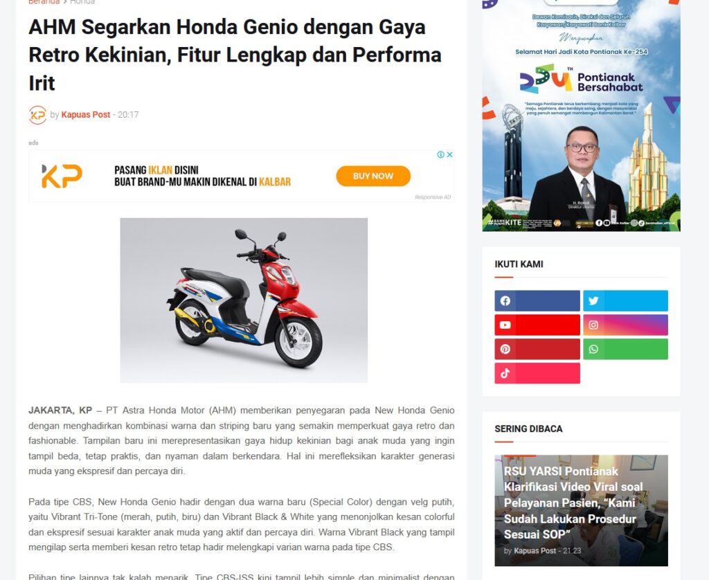 AHM Segarkan Honda Genio dengan Gaya Retro Kekinian, Fitur Lengkap dan Performa Irit by Muhammad Arif 11 November 2025 in Silahkan kunjungi https://www.kapuaspost.web.id/2025/11/ahm-segarkan-honda-genio-dengan-gaya.html. Tags: astra Astra Motor kalbar Astra Motor Pontianak astramotor honda kalbar pontianak sepeda motor You Might Like Regional Public Launching New ADV160 The SUV Pride Grand Launching New PCX 160 Truly Exceptional! Tetap hati-hati ya bro sist berkendara saat hujan.