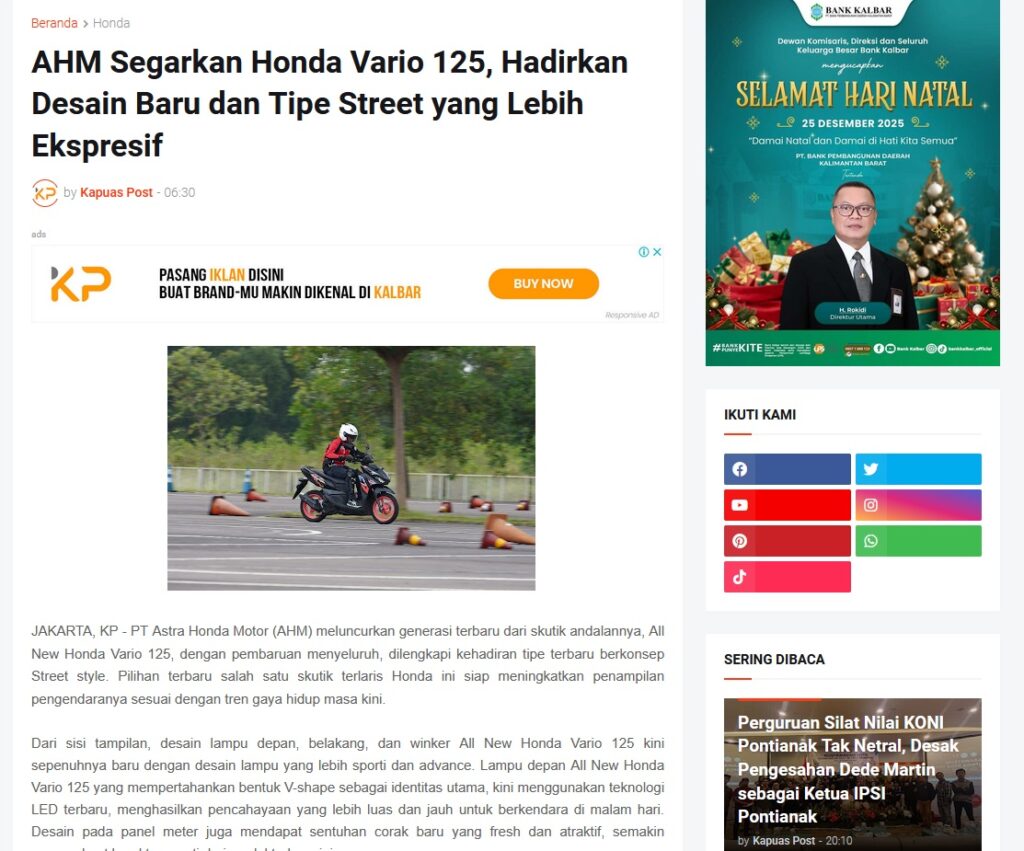 AHM Segarkan Honda Vario 125, Hadirkan Desain Baru dan Tipe Street yang Lebih Ekspresif by Muhammad Arif 23 Desember 2025 in Silahkan kunjungi https://www.kapuaspost.web.id/2025/12/ahm-segarkan-honda-vario-125-hadirkan.html. Tags: astra Astra Motor kalbar Astra Motor Pontianak astramotor honda kalbar pontianak sepeda motor You Might Like Regional Public Launching New ADV160 The SUV Pride Grand Launching New PCX 160 Truly Exceptional! Tetap hati-hati ya bro sist berkendara saat hujan.