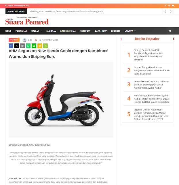 AHM Segarkan New Honda Genio dengan Kombinasi Warna dan Striping Baru by masmul 12 November 2025 in Silahkan kunjungi https://www.suarapemredkalbar.com/read/potret/12112025/ahm-segarkan-new-honda-genio-dengan-kombinasi-warna-dan-striping-baru. You Might Like Regional Public Launching New ADV160 The SUV Pride Grand Launching New PCX 160 Truly Exceptional! Tetap hati-hati ya bro sist berkendara saat hujan.