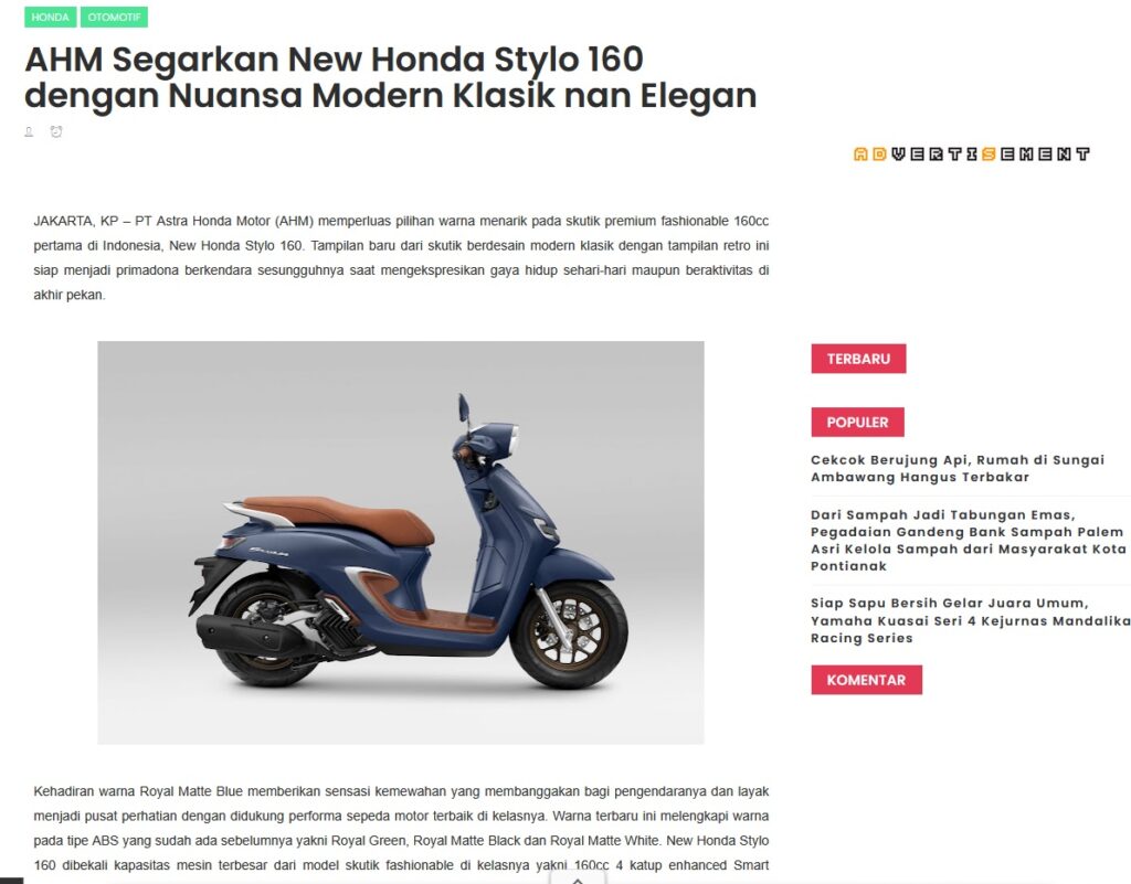 AHM Segarkan New Honda Stylo 160 dengan Nuansa Modern Klasik nan Elegan by Muhammad Arif 27 September 2025 in Silahkan kunjungi https://www.kapuaspost.web.id/2025/09/ahm-segarkan-new-honda-stylo-160-dengan.html. Tags: astra Astra Motor kalbar Astra Motor Pontianak astramotor honda kalbar pontianak sepeda motor You Might Like Regional Public Launching New ADV160 The SUV Pride Grand Launching New PCX 160 Truly Exceptional! Tetap hati-hati ya bro sist berkendara saat hujan.