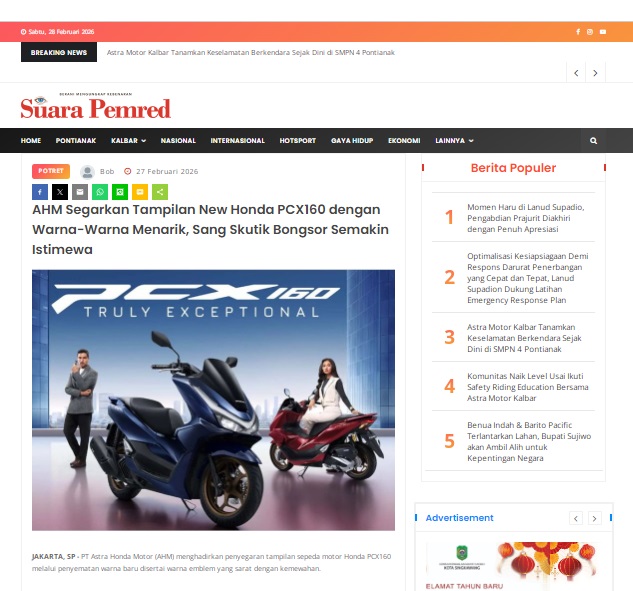AHM Segarkan Tampilan New Honda PCX160 dengan Warna-Warna Menarik, Sang Skutik Bongsor Semakin Istimewa by masmul 27 Februari 2026 in Silahkan kunjungi https://www.suarapemredkalbar.com/read/potret/27022026/ahm-segarkan-tampilan-new-honda-pcx160-dengan-warna-warna-menarik-sang-skutik-bongsor-semakin-istimewa. You Might Like Regional Public Launching New ADV160 The SUV Pride Grand Launching New PCX 160 Truly Exceptional! Tetap hati-hati ya bro sist berkendara saat hujan.