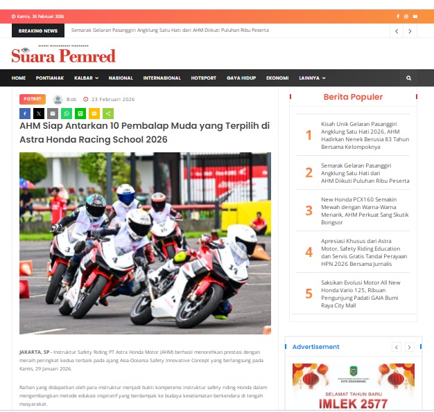AHM Siap Antarkan 10 Pembalap Muda yang Terpilih di Astra Honda Racing School 2026 by masmul 23 Februari 2026 in Silahkan kunjungi https://www.suarapemredkalbar.com/read/potret/23022026/ahm-siap-antarkan-10-pembalap-muda-yang-terpilih-di-astra-honda-racing-school-2026. You Might Like Regional Public Launching New ADV160 The SUV Pride Grand Launching New PCX 160 Truly Exceptional! Tetap hati-hati ya bro sist berkendara saat hujan.