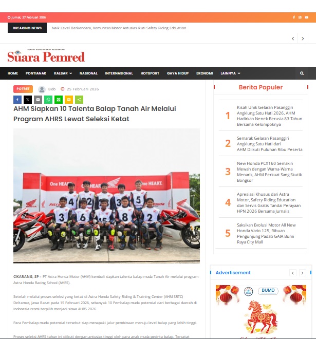 AHM Siapkan 10 Talenta Balap Tanah Air Melalui Program AHRS Lewat Seleksi Ketat by masmul 25 Februari 2026 in Silahkan kunjungi https://www.suarapemredkalbar.com/read/potret/25022026/ahm-siapkan-10-talenta-balap-tanah-air-melalui-program-ahrs-lewat-seleksi-ketat. You Might Like Regional Public Launching New ADV160 The SUV Pride Grand Launching New PCX 160 Truly Exceptional! Tetap hati-hati ya bro sist berkendara saat hujan.