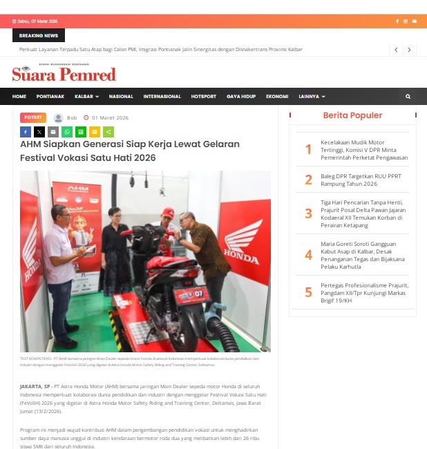 AHM Siapkan Generasi Siap Kerja Lewat Gelaran Festival Vokasi Satu Hati 2026 by masmul 1 Maret 2026 in Silahkan kunjungi https://www.suarapemredkalbar.com/read/potret/01032026/ahm-siapkan-generasi-siap-kerja-lewat-gelaran-festival-vokasi-satu-hati-2026. You Might Like Regional Public Launching New ADV160 The SUV Pride Grand Launching New PCX 160 Truly Exceptional! Tetap hati-hati ya bro sist berkendara saat hujan.