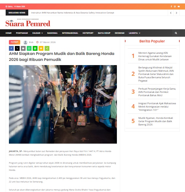 AHM Siapkan Program Mudik dan Balik Bareng Honda 2026 bagi Ribuan Pemudik by masmul 7 Maret 2026 in Silahkan kunjungi https://www.suarapemredkalbar.com/read/potret/07032026/ahm-siapkan-program-mudik-dan-balik-bareng-honda-2026-bagi-ribuan-pemudik. You Might Like Regional Public Launching New ADV160 The SUV Pride Grand Launching New PCX 160 Truly Exceptional! Tetap hati-hati ya bro sist berkendara saat hujan.