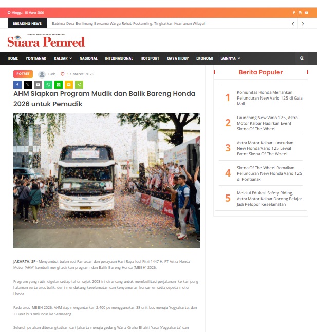 AHM Siapkan Program Mudik dan Balik Bareng Honda 2026 untuk Pemudik by masmul 13 Maret 2026 in Silahkan kunjungi https://www.suarapemredkalbar.com/read/potret/13032026/ahm-siapkan-program-mudik-dan-balik-bareng-honda-2026-untuk-pemudik. You Might Like Regional Public Launching New ADV160 The SUV Pride Grand Launching New PCX 160 Truly Exceptional! Tetap hati-hati ya bro sist berkendara saat hujan.