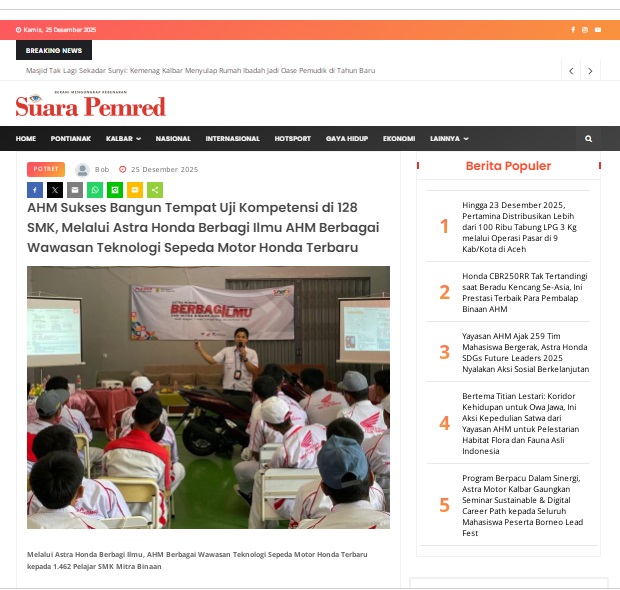 AHM Sukses Bangun Tempat Uji Kompetensi di 128 SMK, Melalui Astra Honda Berbagi Ilmu AHM Berbagai Wawasan Teknologi Sepeda Motor Honda Terbaru by masmul 25 Desember 2025 in Silahkan kunjungi https://www.suarapemredkalbar.com/read/potret/25122025/ahm-sukses-bangun-tempat-uji-kompetensi-di-128-smk-melalui-astra-honda-berbagi-ilmu-ahm-berbagai-wawasan-teknologi-sepeda-motor-honda-terbaru. You Might Like Regional Public Launching New ADV160 The SUV Pride Grand Launching New PCX 160 Truly Exceptional! Tetap hati-hati ya bro sist berkendara saat hujan.