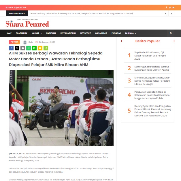AHM Sukses Berbagi Wawasan Teknologi Sepeda Motor Honda Terbaru, Astra Honda Berbagi Ilmu Diapresiasi Pelajar SMK Mitra Binaan AHM by masmul 26 Januari 2026 in Silahkan kunjungi https://www.suarapemredkalbar.com/read/potret/26012026/ahm-sukses-berbagi-wawasan-teknologi-sepeda-motor-honda-terbaru-astra-honda-berbagi-ilmu-diapresiasi-pelajar-smk-mitra-binaan-ahm. You Might Like Regional Public Launching New ADV160 The SUV Pride Grand Launching New PCX 160 Truly Exceptional! Tetap hati-hati ya bro sist berkendara saat hujan.