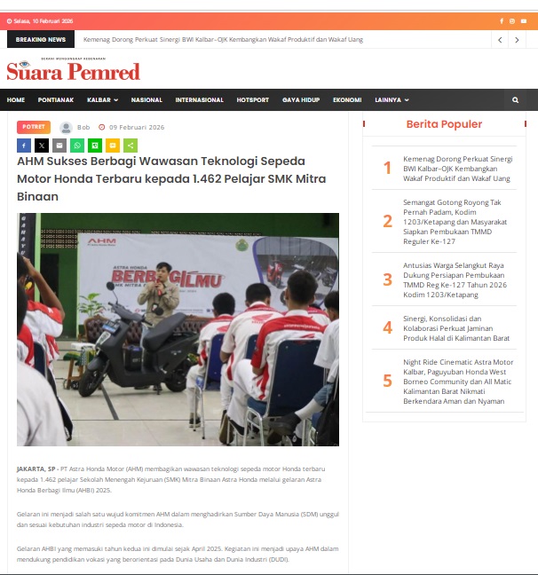 AHM Sukses Berbagi Wawasan Teknologi Sepeda Motor Honda Terbaru kepada 1.462 Pelajar SMK Mitra Binaan by masmul 9 Februari 2026 in Silahkan kunjungi https://www.suarapemredkalbar.com/read/potret/09022026/ahm-sukses-berbagi-wawasan-teknologi-sepeda-motor-honda-terbaru-kepada-1462-pelajar-smk-mitra-binaan. You Might Like Regional Public Launching New ADV160 The SUV Pride Grand Launching New PCX 160 Truly Exceptional! Tetap hati-hati ya bro sist berkendara saat hujan.