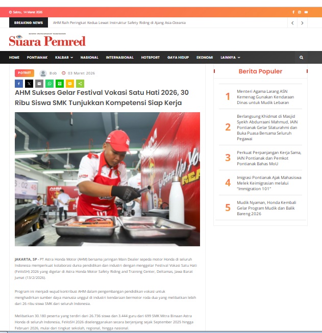 AHM Sukses Gelar Festival Vokasi Satu Hati 2026, 30 Ribu Siswa SMK Tunjukkan Kompetensi Siap Kerja by masmul 3 Maret 2026 in Silahkan kunjungi https://www.suarapemredkalbar.com/read/potret/03032026/ahm-sukses-gelar-festival-vokasi-satu-hati-2026-30-ribu-siswa-smk-tunjukkan-kompetensi-siap-kerja. You Might Like Regional Public Launching New ADV160 The SUV Pride Grand Launching New PCX 160 Truly Exceptional! Tetap hati-hati ya bro sist berkendara saat hujan.