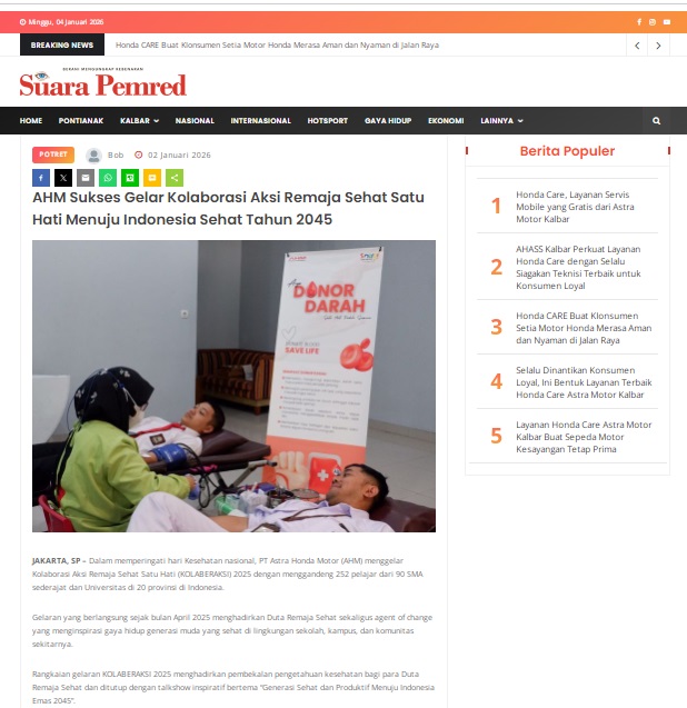 AHM Sukses Gelar Kolaborasi Aksi Remaja Sehat Satu Hati Menuju Indonesia Sehat Tahun 2045 by masmul 2 Januari 2026 in Silahkan kunjungi https://www.suarapemredkalbar.com/read/potret/02012026/ahm-sukses-gelar-kolaborasi-aksi-remaja-sehat-satu-hati-menuju-indonesia-sehat-tahun-2045. You Might Like Regional Public Launching New ADV160 The SUV Pride Grand Launching New PCX 160 Truly Exceptional! Tetap hati-hati ya bro sist berkendara saat hujan.