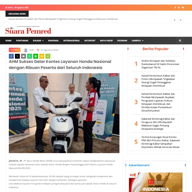 AHM Sukses Gelar Kontes Layanan Honda Nasional dengan Ribuan Peserta dari Seluruh Indonesia by masmul 27 Agustus 2025 in Silahkan kunjungi https://www.suarapemredkalbar.com/read/potret/27082025/ahm-sukses-gelar-kontes-layanan-honda-nasional-dengan-ribuan-peserta-dari-seluruh-indonesia. You Might Like Regional Public Launching New ADV160 The SUV Pride Grand Launching New PCX 160 Truly Exceptional! Tetap hati-hati ya bro sist berkendara saat hujan.