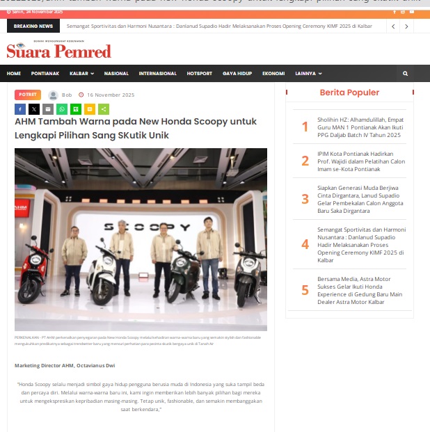 AHM Tambah Warna pada New Honda Scoopy untuk Lengkapi Pilihan Sang SKutik Unik by masmul 16 November 2025 in Silahkan kunjungi https://www.suarapemredkalbar.com/read/potret/16112025/ahm-tambah-warna-pada-new-honda-scoopy-untuk-lengkapi-pilihan-sang-skutik-unik. You Might Like Regional Public Launching New ADV160 The SUV Pride Grand Launching New PCX 160 Truly Exceptional! Tetap hati-hati ya bro sist berkendara saat hujan.
