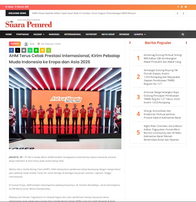 AHM Terus Cetak Prestasi Internasional, Kirim Pebalap Muda Indonesia ke Eropa dan Asia 2026 by masmul 6 Februari 2026 in Silahkan kunjungi https://www.suarapemredkalbar.com/read/potret/06022026/ahm-terus-cetak-prestasi-internasional-kirim-pebalap-muda-indonesia-ke-eropa-dan-asia-2026. You Might Like Regional Public Launching New ADV160 The SUV Pride Grand Launching New PCX 160 Truly Exceptional! Tetap hati-hati ya bro sist berkendara saat hujan.