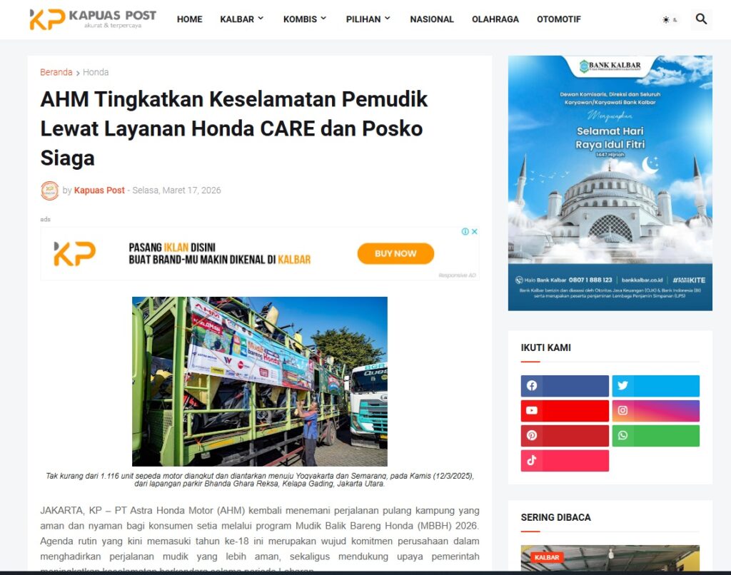 AHM Tingkatkan Keselamatan Pemudik Lewat Layanan Honda CARE dan Posko Siaga by Muhammad Arif 17 Maret 2026 in Silahkan kunjungi https://www.kapuaspost.web.id/2026/03/ahm-tingkatkan-keselamatan-pemudik.html. Tags: astra Astra Motor kalbar Astra Motor Pontianak astramotor honda kalbar pontianak sepeda motor You Might Like Regional Public Launching New ADV160 The SUV Pride Grand Launching New PCX 160 Truly Exceptional! Tetap hati-hati ya bro sist berkendara saat hujan.