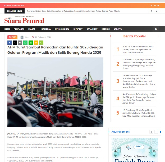 AHM Turut Sambut Ramadan dan Idulfitri 2026 dengan Gelaran Program Mudik dan Balik Bareng Honda 2026 by masmul 18 Februari 2026 in Silahkan kunjungi https://www.suarapemredkalbar.com/read/potret/18022026/ahm-turut-sambut-ramadan-dan-idulfitri-2026-dengan-gelaran-program-mudik-dan-balik-bareng-honda-2026. You Might Like Regional Public Launching New ADV160 The SUV Pride Grand Launching New PCX 160 Truly Exceptional! Tetap hati-hati ya bro sist berkendara saat hujan.