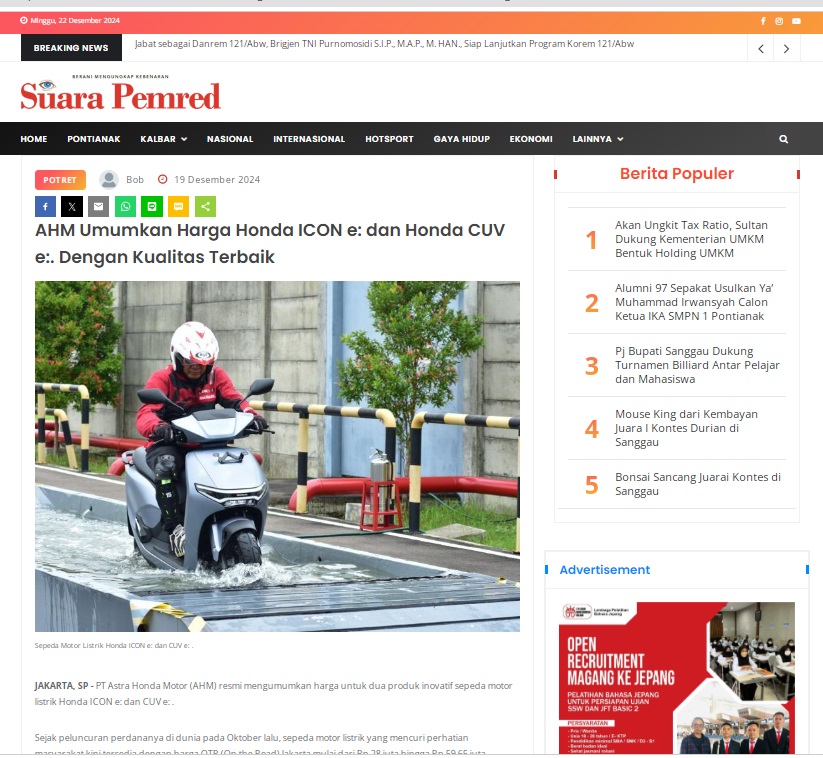 AHM Umumkan Harga Honda ICON e: dan Honda CUV e:. Dengan Kualitas Terbaik by masmul 19 Desember 2024 in Silahkan kunjungi https://www.suarapemredkalbar.com/read/potret/19122024/ahm-umumkan-harga-honda-icon-e-dan-honda-cuv-e-dengan-kualitas-terbaik. You Might Like Regional Public Launching New ADV160 The SUV Pride Grand Launching New PCX 160 Truly Exceptional! Tetap hati-hati ya bro sist berkendara saat hujan.