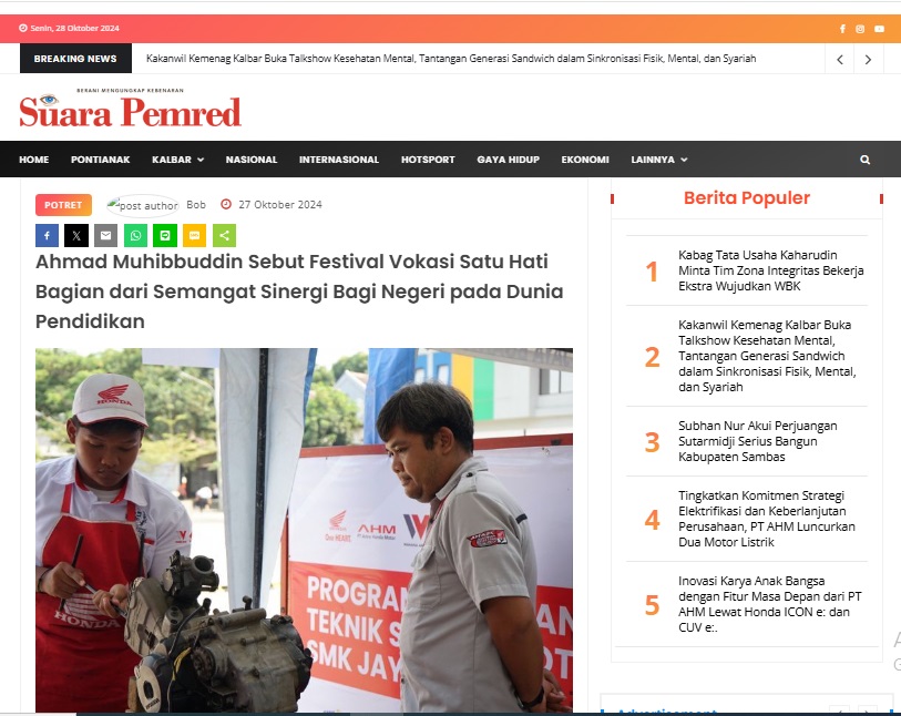 Ahmad Muhibbuddin Sebut Festival Vokasi Satu Hati Bagian dari Semangat Sinergi Bagi Negeri pada Dunia Pendidikan by masmul 27 Oktober 2024 in Silahkan kunjungi https://www.suarapemredkalbar.com/read/potret/27102024/ahmad-muhibbuddin-sebut-festival-vokasi-satu-hati-bagian-dari-semangat-sinergi-bagi-negeri-pada-dunia-pendidikan. You Might Like Regional Public Launching New ADV160 The SUV Pride Grand Launching New PCX 160 Truly Exceptional! Tetap hati-hati ya bro sist berkendara saat hujan.
