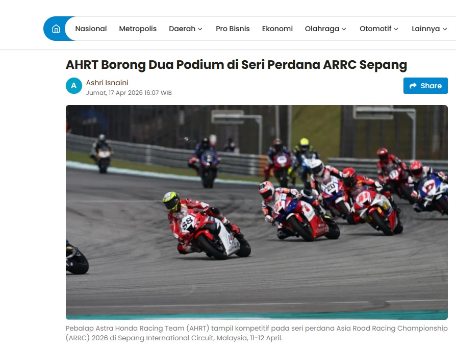 AHRT Borong Dua Podium di Seri Perdana ARRC Sepang by Aristono Edi Kiswantoro 17 April 2026 in Silahkan kunjungi https://pontianakpost.jawapos.com/otomotif/2604170069/ahrt-borong-dua-podium-di-seri-perdana-arrc-sepang. You Might Like Regional Public Launching New ADV160 The SUV Pride Grand Launching New PCX 160 Truly Exceptional! Tetap hati-hati ya bro sist berkendara saat hujan.