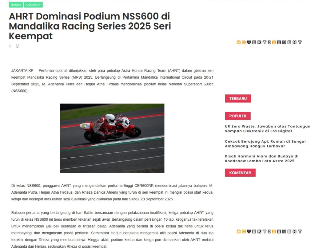 AHRT Dominasi Podium NSS600 di Mandalika Racing Series 2025 Seri Keempat