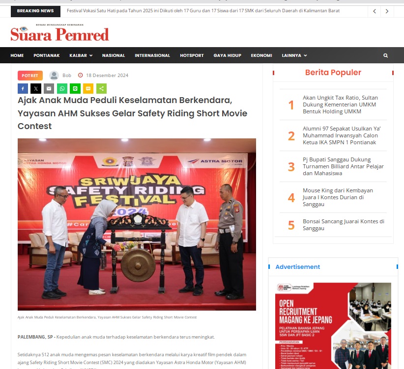 Ajak Anak Muda Peduli Keselamatan Berkendara, Yayasan AHM Sukses Gelar Safety Riding Short Movie Contest by masmul 18 Desember 2024 in Silahkan kunjungi https://www.suarapemredkalbar.com/read/potret/18122024/ajak-anak-muda-peduli-keselamatan-berkendara-yayasan-ahm-sukses-gelar-safety-riding-short-movie-contest. You Might Like Regional Public Launching New ADV160 The SUV Pride Grand Launching New PCX 160 Truly Exceptional! Tetap hati-hati ya bro sist berkendara saat hujan.
