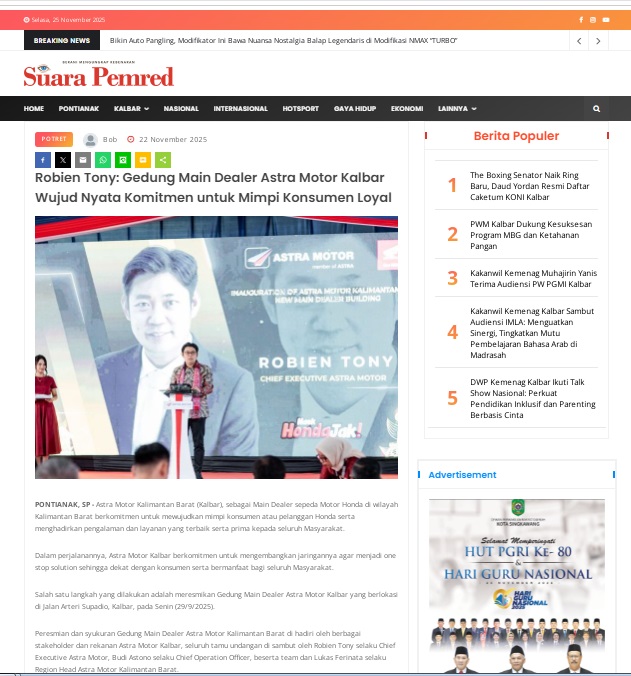 Ajak Jurnalis dan Blogger Keliling di Gedung Mega New Main Dealer, Astra Motor Kalbar Tunjukkan Apresiasi Terbaik by masmul 22 November 2025 in Silahkan kunjungi https://www.suarapemredkalbar.com/read/potret/22112025/ajak-jurnalis-dan-blogger-keliling-di-gedung-mega-new-main-dealer-astra-motor-kalbar-tunjukkan-apresiasi-terbaik. You Might Like Regional Public Launching New ADV160 The SUV Pride Grand Launching New PCX 160 Truly Exceptional! Tetap hati-hati ya bro sist berkendara saat hujan.