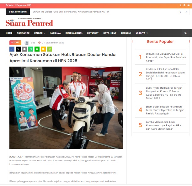 Ajak Konsumen Satukan Hati, Ribuan Dealer Honda Apresiasi Konsumen di HPN 2025 by masmul 21 September 2025 in Silahkan kunjungi https://www.suarapemredkalbar.com/read/potret/21092025/ajak-konsumen-satukan-hati-ribuan-dealer-honda-apresiasi-konsumen-di-hpn-2025. You Might Like Regional Public Launching New ADV160 The SUV Pride Grand Launching New PCX 160 Truly Exceptional! Tetap hati-hati ya bro sist berkendara saat hujan.