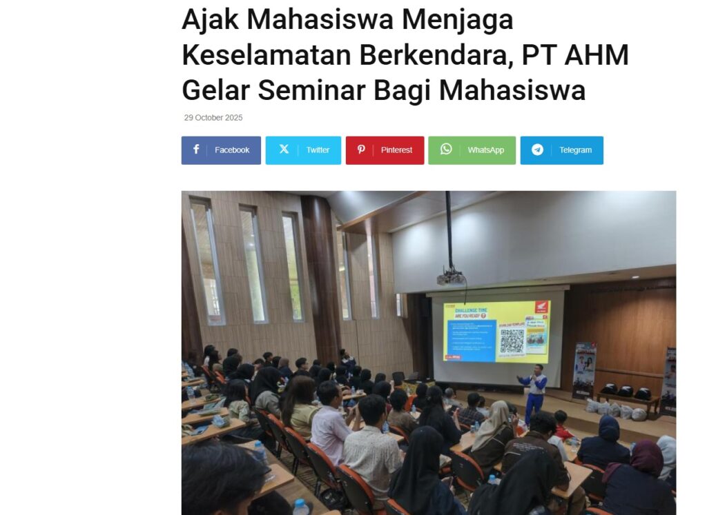 Ajak Mahasiswa Menjaga Keselamatan Berkendara, PT AHM Gelar Seminar Bagi Mahasiswa by Nova Sari 29 Oktober 2025 in Silahkan kunjungi https://equator.co.id/ajak-mahasiswa-menjaga-keselamatan-berkendara-pt-ahm-gelar-seminar-bagi-mahasiswa/. You Might Like Regional Public Launching New ADV160 The SUV Pride Grand Launching New PCX 160 Truly Exceptional! Tetap hati-hati ya bro sist berkendara saat hujan.