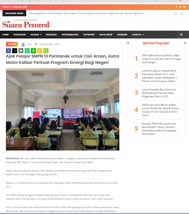 Ajak Pelajar SMPN 13 Pontianak untuk Cari Aman, Astra Motor Kalbar Perkuat Program Sinergi Bagi Negeri by masmul 14 Desember 2025 in Silahkan kunjungi https://www.suarapemredkalbar.com/read/potret/14122025/ajak-pelajar-smpn-13-pontianak-untuk-cari-aman-astra-motor-kalbar-perkuat-program-sinergi-bagi-negeri. You Might Like Regional Public Launching New ADV160 The SUV Pride Grand Launching New PCX 160 Truly Exceptional! Tetap hati-hati ya bro sist berkendara saat hujan.
