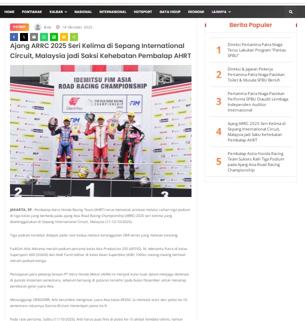 Ajang ARRC 2025 Seri Kelima di Sepang International Circuit, Malaysia jadi Saksi Kehebatan Pembalap AHRT by masmul 18 Oktober 2025 in Silahkan kunjungi https://www.suarapemredkalbar.com/read/potret/18102025/ajang-arrc-2025-seri-kelima-di-sepang-international-circuit-malaysia-jadi-saksi-kehebatan-pembalap-ahrt. You Might Like Regional Public Launching New ADV160 The SUV Pride Grand Launching New PCX 160 Truly Exceptional! Tetap hati-hati ya bro sist berkendara saat hujan.