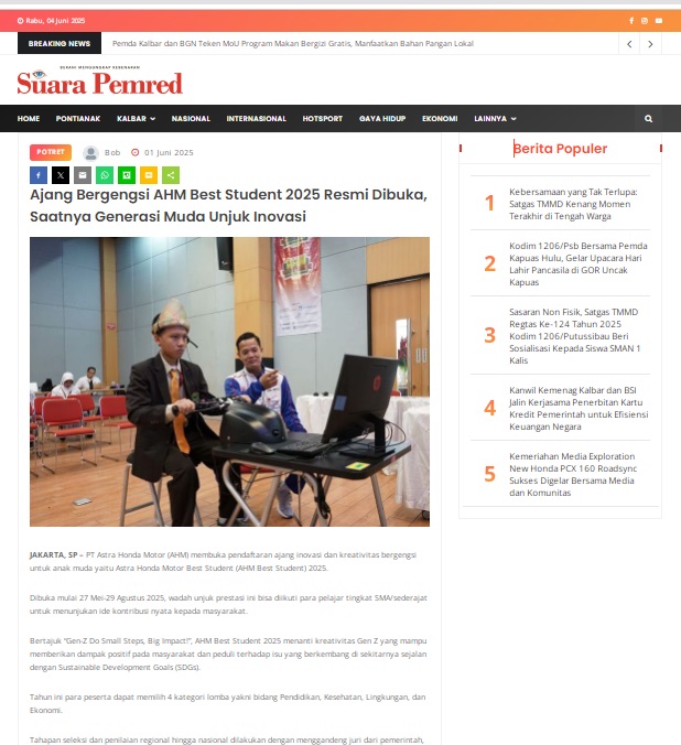 Ajang Bergengsi AHM Best Student 2025 Resmi Dibuka, Saatnya Generasi Muda Unjuk Inovasi by masmul 1 Juni 2025 in Silahkan kunjungi https://www.suarapemredkalbar.com/read/potret/01062025/ajang-bergengsi-ahm-best-student-2025-resmi-dibuka-saatnya-generasi-muda-unjuk-inovasi. You Might Like Regional Public Launching New ADV160 The SUV Pride Grand Launching New PCX 160 Truly Exceptional! Tetap hati-hati ya bro sist berkendara saat hujan.