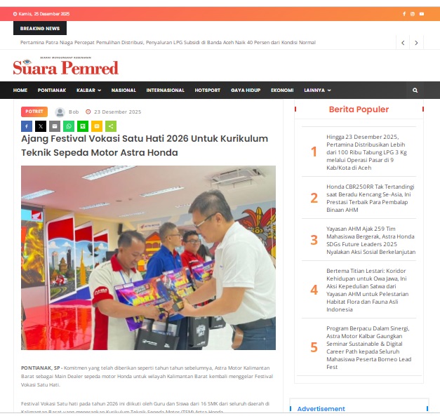 Ajang Festival Vokasi Satu Hati 2026 Untuk Kurikulum Teknik Sepeda Motor Astra Honda by masmul 23 Desember 2025 in Silahkan kunjungi https://www.suarapemredkalbar.com/read/potret/23122025/ajang-festival-vokasi-satu-hati-2026-untuk-kurikulum-teknik-sepeda-motor-astra-honda. You Might Like Regional Public Launching New ADV160 The SUV Pride Grand Launching New PCX 160 Truly Exceptional! Tetap hati-hati ya bro sist berkendara saat hujan.