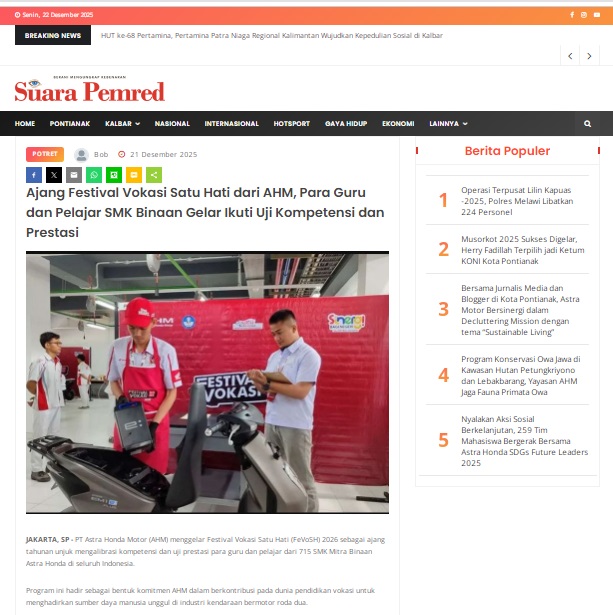 Ajang Festival Vokasi Satu Hati dari AHM, Para Guru dan Pelajar SMK Binaan Gelar Ikuti Uji Kompetensi dan Prestasi by masmul 21 Desember 2025 in Silahkan kunjungi https://www.suarapemredkalbar.com/read/potret/21122025/ajang-festival-vokasi-satu-hati-dari-ahm-para-guru-dan-pelajar-smk-binaan-gelarikuti-uji-kompetensi-dan-prestasi. You Might Like Regional Public Launching New ADV160 The SUV Pride Grand Launching New PCX 160 Truly Exceptional! Tetap hati-hati ya bro sist berkendara saat hujan.