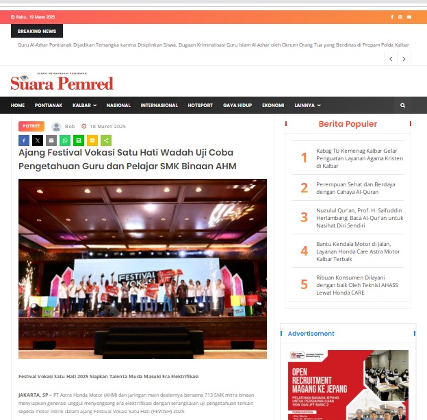 Ajang Festival Vokasi Satu Hati Wadah Uji Coba Pengetahuan Guru dan Pelajar SMK Binaan AHM by masmul 18 Maret 2025 in Silahkan kunjungi https://www.suarapemredkalbar.com/read/potret/18032025/ajang-festival-vokasi-satu-hati-wadah-uji-coba-pengetahuan-guru-dan-pelajar-smk-binaan-ahm. You Might Like Regional Public Launching New ADV160 The SUV Pride Grand Launching New PCX 160 Truly Exceptional! Tetap hati-hati ya bro sist berkendara saat hujan.