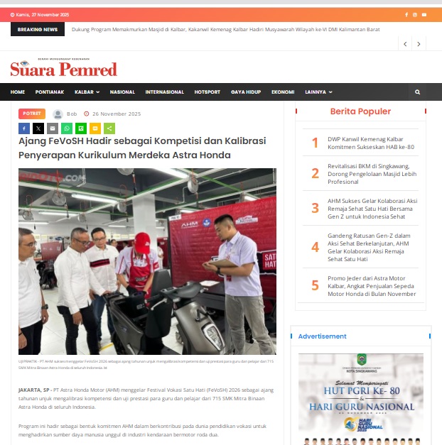 Ajang FeVoSH Hadir sebagai Kompetisi dan Kalibrasi Penyerapan Kurikulum Merdeka Astra Honda by masmul 26 November 2025 in Silahkan kunjungi https://www.suarapemredkalbar.com/read/potret/26112025/ajang-fevosh-hadir-sebagai-kompetisi-dan-kalibrasi-penyerapan-kurikulum-merdeka-astra-honda. You Might Like Regional Public Launching New ADV160 The SUV Pride Grand Launching New PCX 160 Truly Exceptional! Tetap hati-hati ya bro sist berkendara saat hujan.