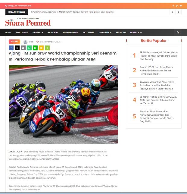 Ajang FIM JuniorGP World Championship Seri Keenam, Ini Performa Terbaik Pembalap Binaan AHM by masmul 8 November 2025 in Silahkan kunjungi https://www.suarapemredkalbar.com/read/potret/08112025/ajang-fim-juniorgp-world-championship-seri-keenam-ini-performa-terbaik-pembalap-binaan-ahm. You Might Like Regional Public Launching New ADV160 The SUV Pride Grand Launching New PCX 160 Truly Exceptional! Tetap hati-hati ya bro sist berkendara saat hujan.