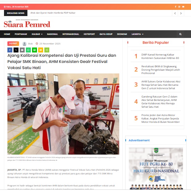 Ajang Kalibrasi Kompetensi dan Uji Prestasi Guru dan Pelajar SMK Binaan, AHM Konsisten Gealr Festival Vokasi Satu Hati by masmul 23 November 2025 in Silahkan kunjungi https://www.suarapemredkalbar.com/read/potret/23112025/ajang-kalibrasi-kompetensi-dan-uji-prestasi-guru-dan-pelajar-smk-binaan-ahm-konsisten-gealr-festival-vokasi-satu-hati. You Might Like Regional Public Launching New ADV160 The SUV Pride Grand Launching New PCX 160 Truly Exceptional! Tetap hati-hati ya bro sist berkendara saat hujan.