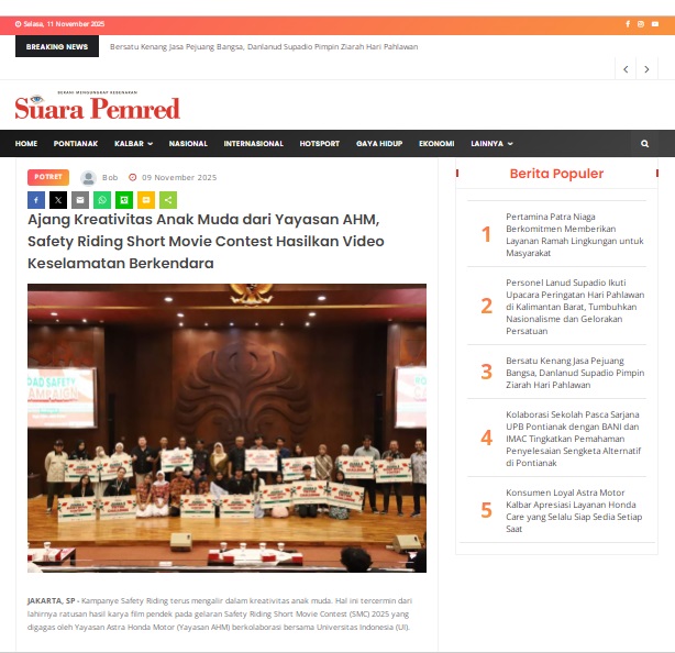 Ajang Kreativitas Anak Muda dari Yayasan AHM, Safety Riding Short Movie Contest Hasilkan Video Keselamatan Berkendara by masmul 9 November 2025 in Silahkan kunjungi https://www.suarapemredkalbar.com/read/potret/09112025/ajang-kreativitas-anak-muda-dari-yayasan-ahm-safety-riding-short-movie-contest-hasilkan-video-keselamatan-berkendara. You Might Like Regional Public Launching New ADV160 The SUV Pride Grand Launching New PCX 160 Truly Exceptional! Tetap hati-hati ya bro sist berkendara saat hujan.