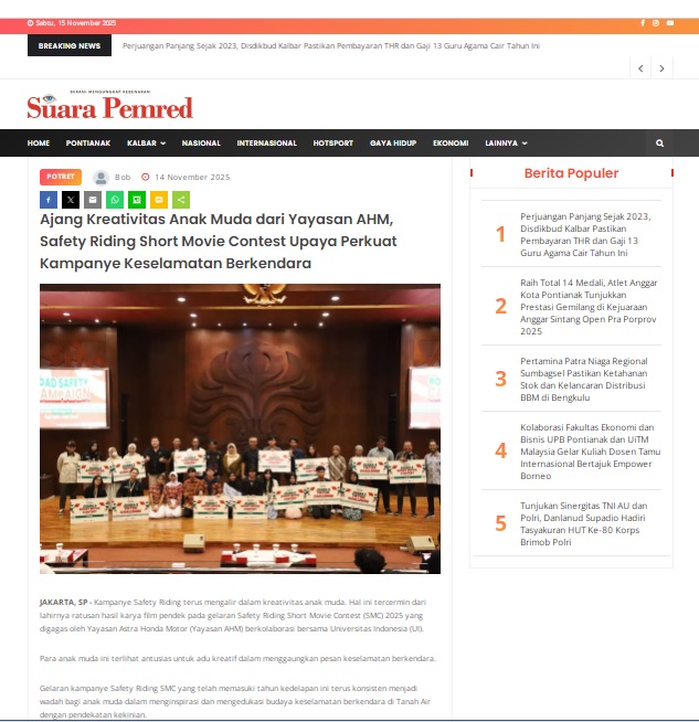 Ajang Kreativitas Anak Muda dari Yayasan AHM, Safety Riding Short Movie Contest Upaya Perkuat Kampanye Keselamatan Berkendara by masmul 14 November 2025 in Silahkan kunjungi https://www.suarapemredkalbar.com/read/potret/14112025/ajang-kreativitas-anak-muda-dari-yayasan-ahm-safety-riding-short-movie-contest-upaya-perkuat-kampanye-keselamatan-berkendara. You Might Like Regional Public Launching New ADV160 The SUV Pride Grand Launching New PCX 160 Truly Exceptional! Tetap hati-hati ya bro sist berkendara saat hujan.