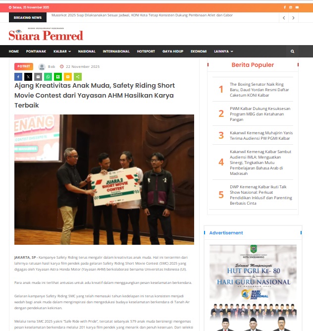 Ajang Kreativitas Anak Muda, Safety Riding Short Movie Contest dari Yayasan AHM Hasilkan Karya Terbaik by masmul 22 November 2025 in Silahkan kunjungi https://www.suarapemredkalbar.com/read/potret/22112025/ajang-kreativitas-anak-muda-safety-riding-short-movie-contest-dari-yayasan-ahmhasilkan-karya-terbaik. You Might Like Regional Public Launching New ADV160 The SUV Pride Grand Launching New PCX 160 Truly Exceptional! Tetap hati-hati ya bro sist berkendara saat hujan.