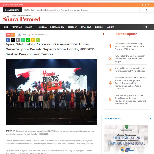 Ajang Silaturahmi Akbar dan Kebersamaan Lintas Generasi para Pecinta Sepeda Motor Honda, HBD 2025 Berikan Pengalaman Terbaik by masmul 20 November 2025 in Silahkan kunjungi https://www.suarapemredkalbar.com/read/potret/20112025/ajang-silaturahmi-akbar-dan-kebersamaan-lintas-generasi-para-pecinta-sepeda-motor-honda-hbd-2025-berikan-pengalaman-terbaik. You Might Like Regional Public Launching New ADV160 The SUV Pride Grand Launching New PCX 160 Truly Exceptional! Tetap hati-hati ya bro sist berkendara saat hujan.