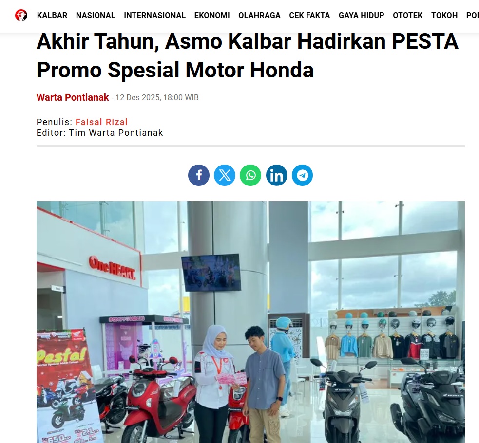 Akhir Tahun, Asmo Kalbar Hadirkan PESTA Promo Spesial Motor Honda by Faisal Rizal 12 Desember 2025 in Silahkan kunjungi https://wartapontianak.pikiran-rakyat.com/gaya-hidup/pr-1179856816/akhir-tahun-asmo-kalbar-hadirkan-pesta-promo-spesial-motor-honda. You Might Like Regional Public Launching New ADV160 The SUV Pride Grand Launching New PCX 160 Truly Exceptional! Tetap hati-hati ya bro sist berkendara saat hujan.