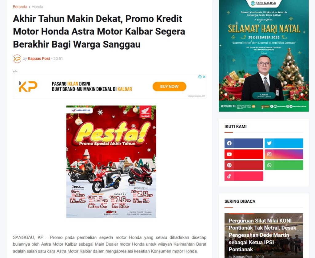 Akhir Tahun Makin Dekat, Promo Kredit Motor Honda Astra Motor Kalbar Segera Berakhir Bagi Warga Sanggau by Muhammad Arif 25 Desember 2025 in Silahkan kunjungi https://www.kapuaspost.web.id/2025/12/akhir-tahun-makin-dekat-promo-kredit.html. Tags: astra Astra Motor kalbar Astra Motor Pontianak astramotor honda kalbar pontianak sepeda motor You Might Like Regional Public Launching New ADV160 The SUV Pride Grand Launching New PCX 160 Truly Exceptional! Tetap hati-hati ya bro sist berkendara saat hujan.