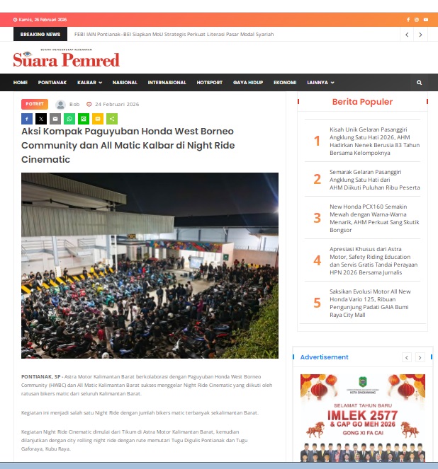 Aksi Kompak Paguyuban Honda West Borneo Community dan All Matic Kalbar di Night Ride Cinematic by masmul 24 Februari 2026 in Silahkan kunjungi https://www.suarapemredkalbar.com/read/potret/24022026/aksi-kompak-paguyuban-honda-west-borneo-community-dan-all-matic-kalbar-di-night-ride-cinematic. You Might Like Regional Public Launching New ADV160 The SUV Pride Grand Launching New PCX 160 Truly Exceptional! Tetap hati-hati ya bro sist berkendara saat hujan.