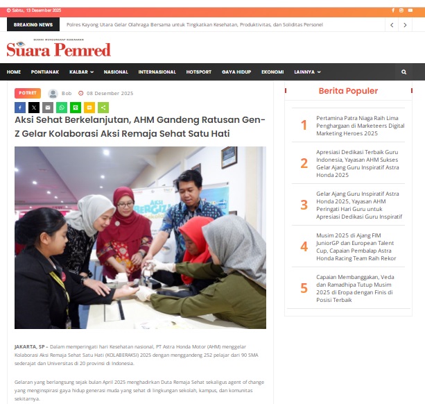 Aksi Sehat Berkelanjutan, AHM Gandeng Ratusan Gen-Z Gelar Kolaborasi Aksi Remaja Sehat Satu Hati by masmul 8 Desember 2025 in Silahkan kunjungi https://www.suarapemredkalbar.com/read/potret/08122025/aksi-sehat-berkelanjutan-ahm-gandeng-ratusan-gen-z-gelar-kolaborasi-aksi-remaja-sehat-satu-hati. You Might Like Regional Public Launching New ADV160 The SUV Pride Grand Launching New PCX 160 Truly Exceptional! Tetap hati-hati ya bro sist berkendara saat hujan.