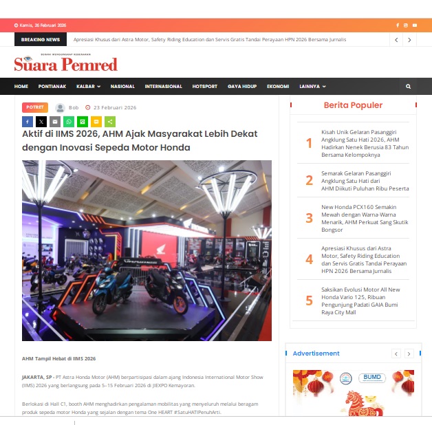 Aktif di IIMS 2026, AHM Ajak Masyarakat Lebih Dekat dengan Inovasi Sepeda Motor Honda by masmul 23 Februari 2026 in Silahkan kunjungi https://www.suarapemredkalbar.com/read/potret/23022026/aktif-di-iims-2026-ahm-ajak-masyarakat-lebih-dekat-dengan-inovasi-sepeda-motor-honda. You Might Like Regional Public Launching New ADV160 The SUV Pride Grand Launching New PCX 160 Truly Exceptional! Tetap hati-hati ya bro sist berkendara saat hujan.