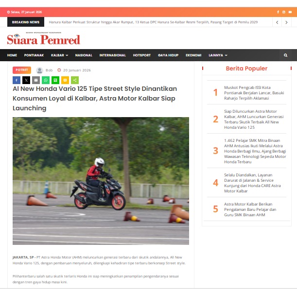 Al New Honda Vario 125 Tipe Street Style Dinantikan Konsumen Loyal di Kalbar, Astra Motor Kalbar Siap Launching by masmul 20 Januari 2026 in Silahkan kunjungi https://www.suarapemredkalbar.com/read/potret/20012026/al-new-honda-vario-125-tipe-street-style-dinantikan-konsumen-loyal-di-kalbar-astra-motor-kalbar-siap-launching. You Might Like Regional Public Launching New ADV160 The SUV Pride Grand Launching New PCX 160 Truly Exceptional! Tetap hati-hati ya bro sist berkendara saat hujan.