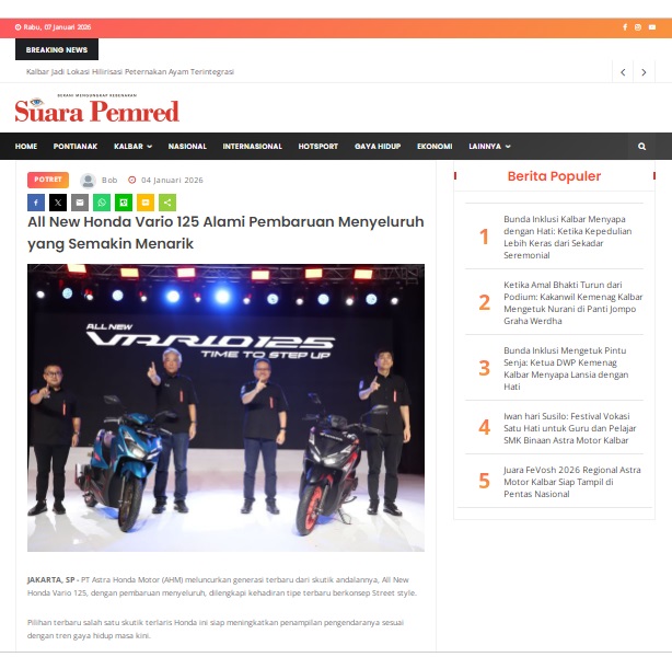 All New Honda Vario 125 Alami Pembaruan Menyeluruh yang Semakin Menarik by masmul 4 Januari 2026 in Silahkan kunjungi https://www.suarapemredkalbar.com/read/potret/04012026/all-new-honda-vario-125-alami-pembaruan-menyeluruh-yang-semakin-menarik. You Might Like Regional Public Launching New ADV160 The SUV Pride Grand Launching New PCX 160 Truly Exceptional! Tetap hati-hati ya bro sist berkendara saat hujan.