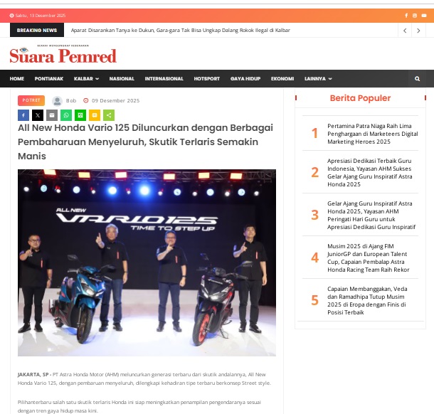 All New Honda Vario 125 Diluncurkan dengan Berbagai Pembaharuan Menyeluruh, Skutik Terlaris Semakin Manis by masmul 9 Desember 2025 in Silahkan kunjungi https://www.suarapemredkalbar.com/read/potret/09122025/all-new-honda-vario-125-diluncurkan-dengan-berbagai-pembaharuan-menyeluruh-skutik-terlaris-semakin-manis. You Might Like Regional Public Launching New ADV160 The SUV Pride Grand Launching New PCX 160 Truly Exceptional! Tetap hati-hati ya bro sist berkendara saat hujan.